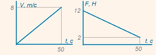 График зависимости модулей скорости v авиамодели и силы F тяги ее моторчика от времени t представлены на рисунках 1 и 2 соответственно. Постройте график зависимости мощности моторчика P от времени t и определите, в какой момент времени tx мощность была наибольшей. Чему была равна эта мощность?