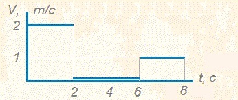 Зависимость скорости пешехода V от времени приведена на графике. Найти среднюю скорость пешехода за первые 8 секунд. Найти среднюю скорость за большой промежуток времени, если, начиная с момента t = 6 с, скорость равна 1 м/c.